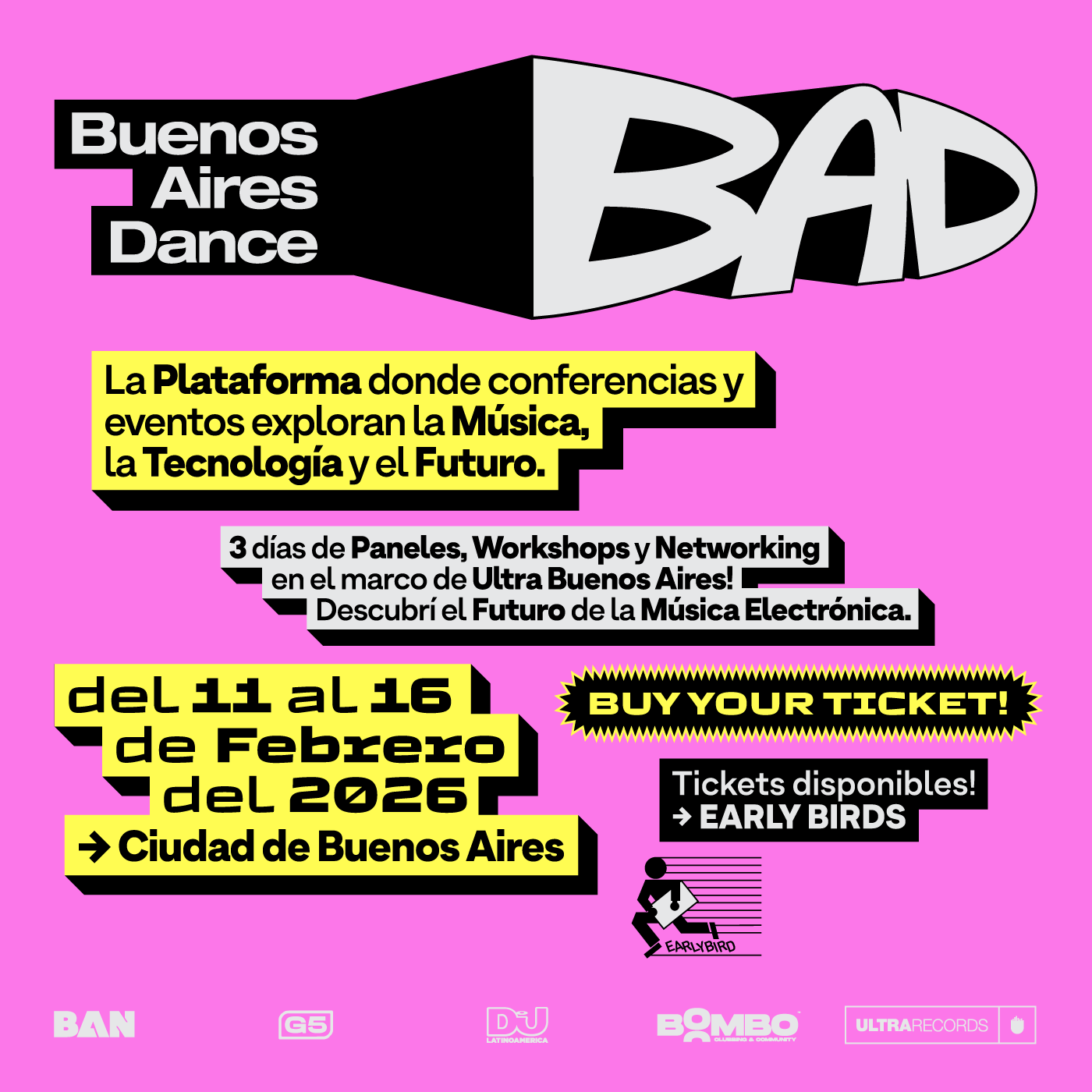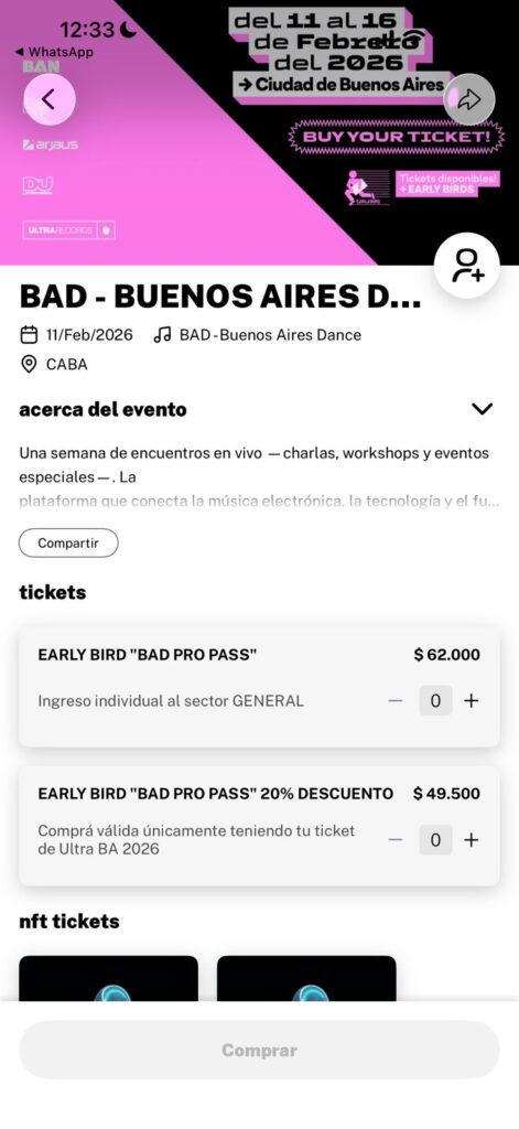 Si tenés tu entrada para Ultra Buenos Aires, accedés a un 20% de descuento para BAD. El beneficio se aplica automáticamente cuando la entrada de Ultra está en tu perfil de BOMBO.
